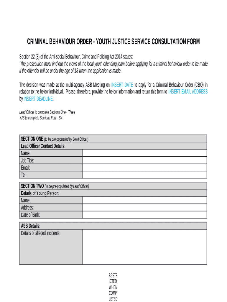 Instructions for the form YJS Criminal Behaviour Order Consultation