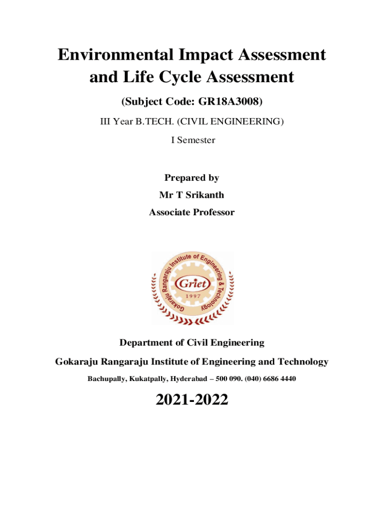 Environmental Impact Assessment and Life Cycle Assessment (Subject Code: GR18A3008) III Year B.TECH. (CIVIL ENGINEERING) I SemesterPrepared by Mr T Srikanth Associate ProfessorDepartment of Civil