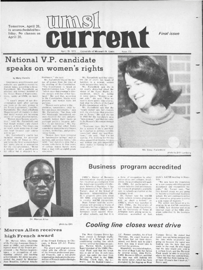 Tomorrow, April 20, is an unscheduled holiday. No classes on April 20.Final issueApril 19, 1973University of MissouriSt. LouisIssue 172National V.P. candidate speaks on \'WoInen\'s rights by Mary