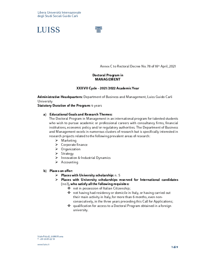 Libera Universit Internazionale degli Studi Sociali Guido CarliAnnex C to Rectoral Decree No. 78 of 16th April, 2021 Doctoral Program in MANAGEMENT XXXVII Cycle 2021/2022 Academic Year Administrative