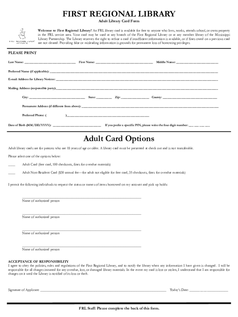 FIRST REGIONAL LIBRARY Adult Library Card Form Welcome to First Regional Library! An FRL library card is available for free to anyone who lives, works, attends school, or owns property in the FRL