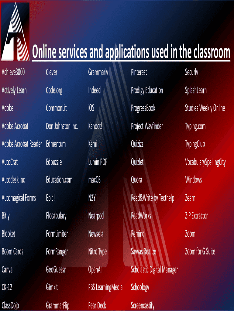 Achieve3000Online services and applications used in the classroom CleverGrammarlyPinterestSecurlyActively LearnCode.orgIndeedProdigy EducationSplashLearnAdobeCommonLitiOSProgressBookStudies Weekly
