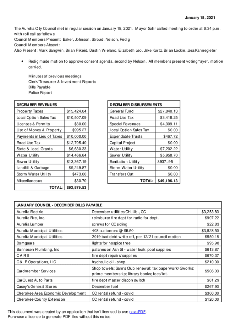 January 18, 2021 The Aurelia City Council met in regular session on January 18, 2021. Mayor Suhr called meeting to order at 6:34 p.m. with roll call as follows: Council Members Present: Baker, Johnson,