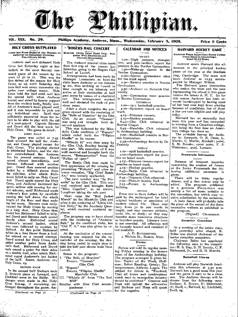VOL. XXX.No. 29.Phillips Academy, Andover, Mass., Wednesday, February 5, 1908.HOLY CROSs OTPLAYED U Loses her First Game of the Season to Andover on Saturday Evening. Final Score 3021.:*OGERSHALL