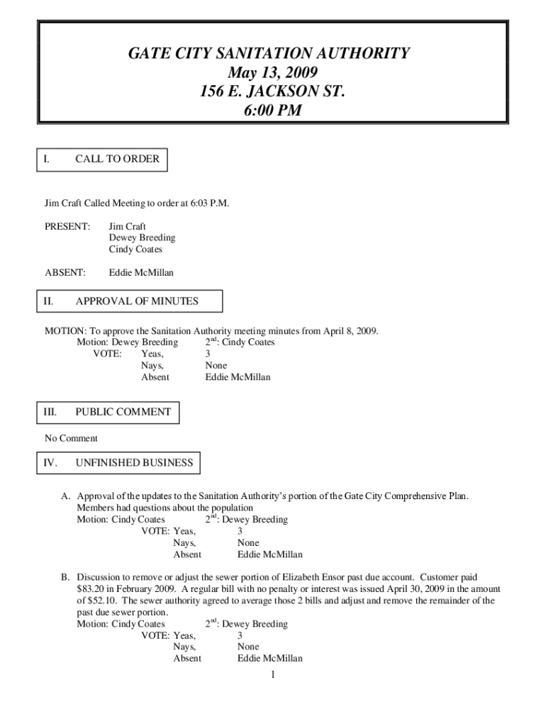 GATE CITY SANITATION AUTHORITY May 13, 2009 156 E. JACKSON ST. 6:00 PM I.CALL TO ORDERJim Craft Called Meeting to order at 6:03 P.M. PRESENT:Jim Craft Dewey Breeding Cindy CoatesABSENT:Eddie McMillanII.APPROVAL