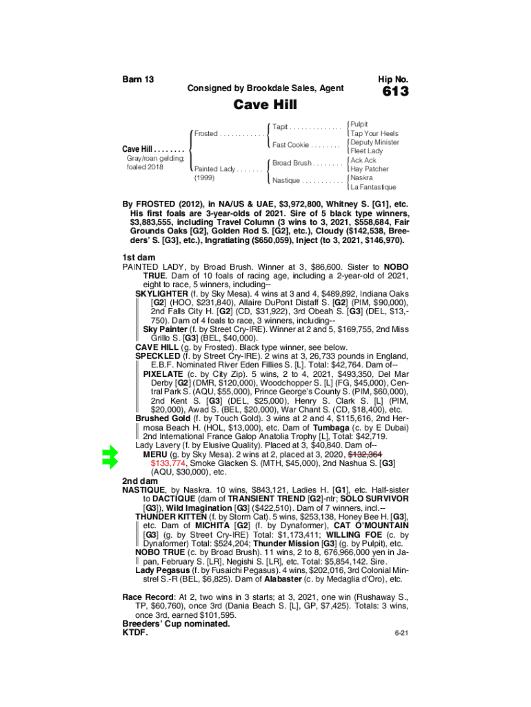 613Barn 13Hip No. Consigned by Brookdale Sales, Agent613Cave HillFrosted . . . . . . . . . . . .Cave Hill . . . . . . . . Gray/roan gelding; foaled 2018Painted Lady . . . . . . . (1999) Tapit . .