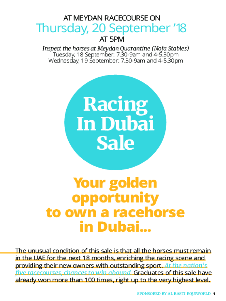 AT MEYDAN RACECOURSE ONThursday, 20 September 18 AT 5PMInspect the horses at Meydan Quarantine (Nofa Stables) Tuesday, 18 September: 7.309am and 45.30pm Wednesday, 19 September: 7.309am and 45.30pmRacing