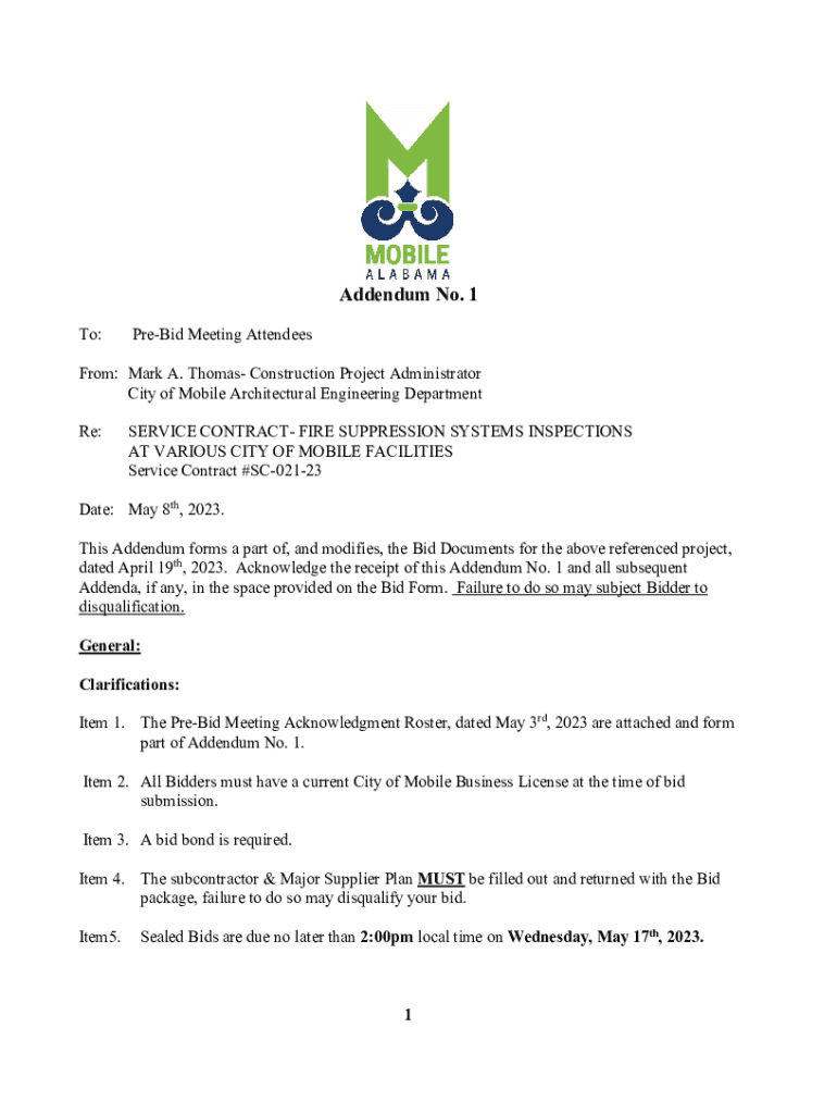 Addendum No. 1 To:PreBid Meeting AttendeesFrom: Mark A. Thomas Construction Project Administrator City of Mobile Architectural Engineering Department Re:SERVICE CONTRACT FIRE SUPPRESSION SYSTEMS INSPECTIONS