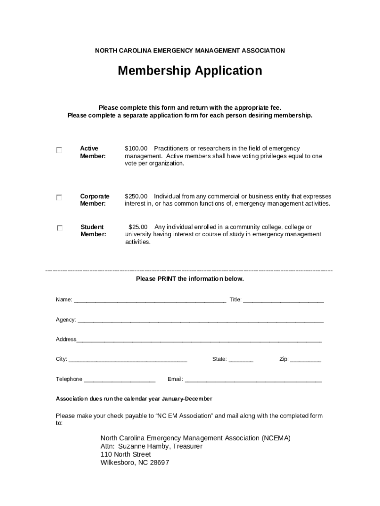 What is NORTH CAROLINA EMERGENCY MANAGEMENT ASSOCIATIONMembership ApplicationPlease complete this and return with the appropriate Form?