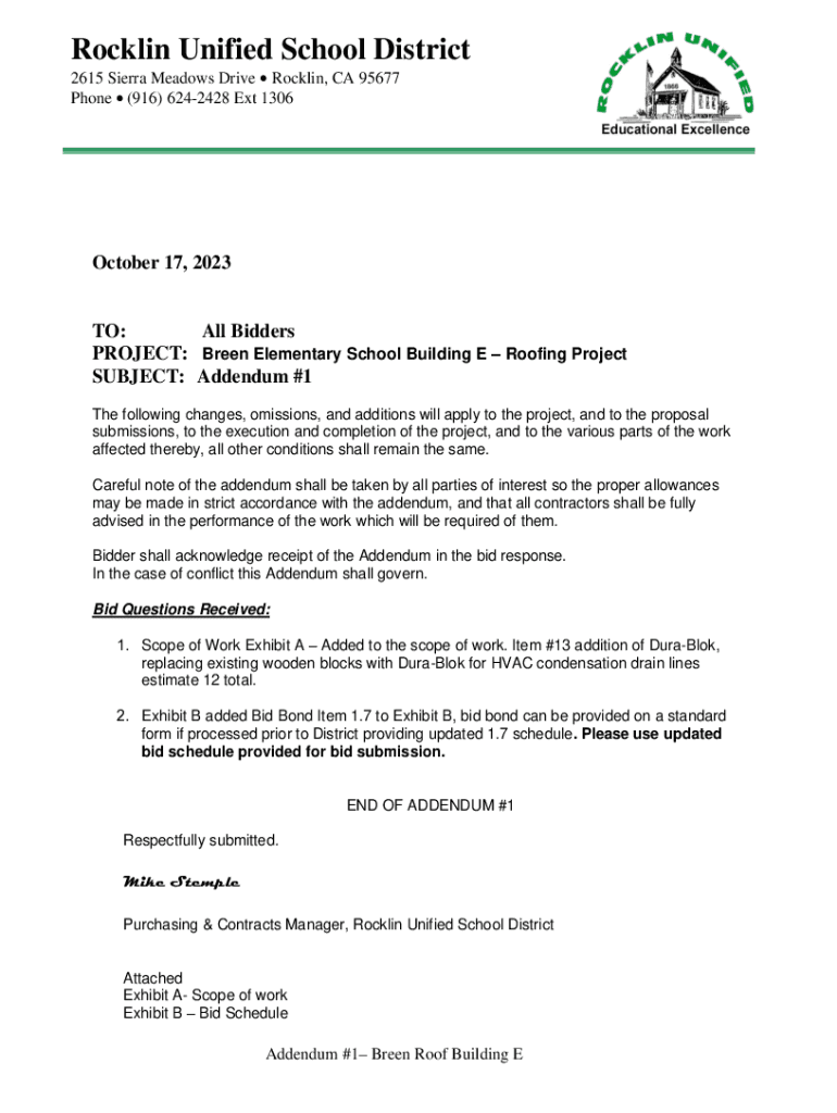 Rocklin Unified School District 2615 Sierra Meadows Drive Rocklin, CA 95677 Phone (916) 6242428 Ext 1306October 17, 2023TO: All Bidders PROJECT: Breen Elementary School Building E Roofing Project