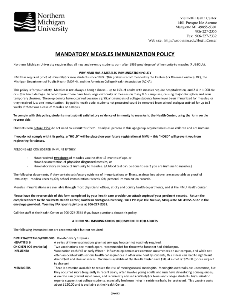 Vielmetti Health Center 1401 Presque Isle Avenue Marquette MI 498555301 9062272355 Fax: 9062272332 Web site: http://webb.nmu.edu/HealthCenterMANDATORY MEASLES IMMUNIZATION POLICY Northern Michigan