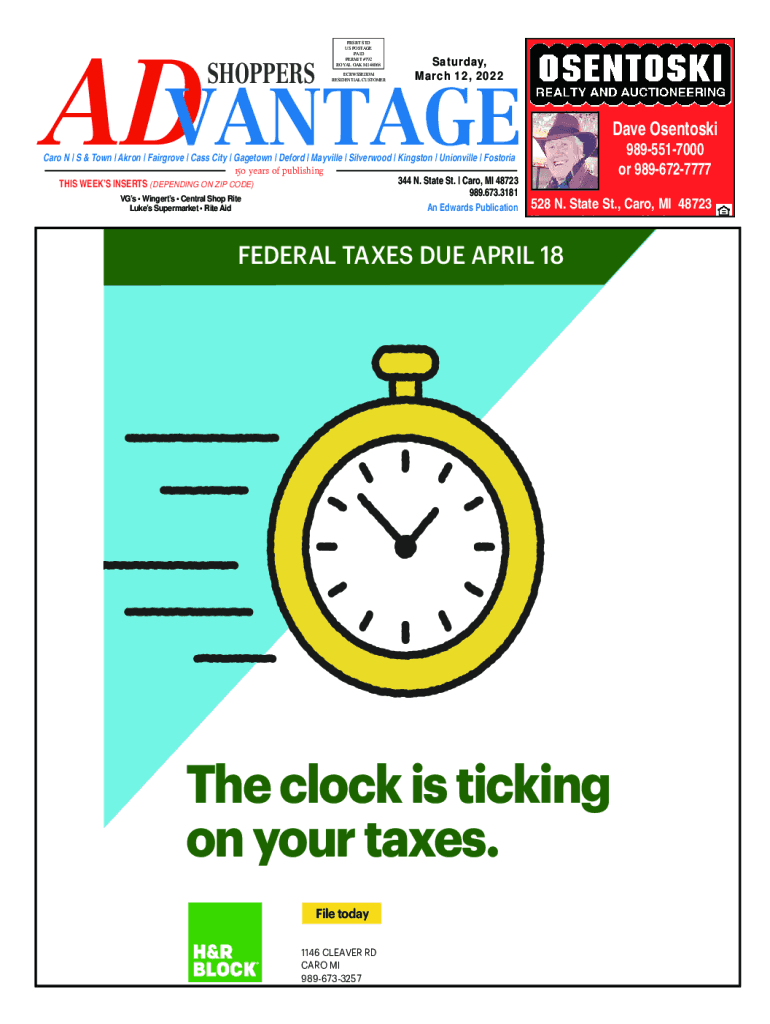 ADVANTAGE PRSRT STD US POSTAGE PAID PERMIT #792 ROYAL OAK MI 48068SHOPPERSECRWSSEDDM RESIDENTIAL CUSTOMERSaturday, March 12, 2022Dave Osentoski 9895517000 or 9896727777Caro N | S & Town | Akron |