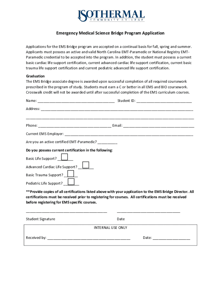 Emergency Medical Science Bridge Program Application Applications for the EMS Bridge program are accepted on a continual basis for fall, spring and summer. Applicants must possess an active and valid