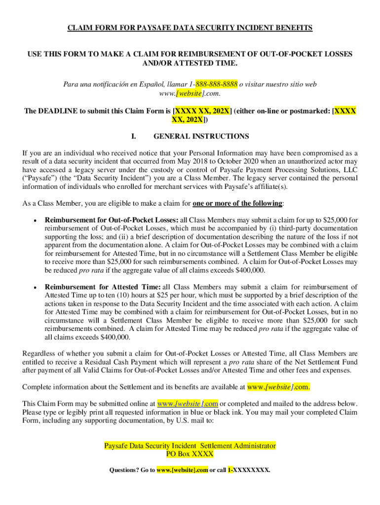 CLAIM FORM FOR PAYSAFE DATA SECURITY INCIDENT BENEFITSUSE THIS FORM TO MAKE A CLAIM FOR REIMBURSEMENT OF OUTOFPOCKET LOSSES AND/OR ATTESTED TIME. Para una notificacin en Espaol, llamar 18888888888