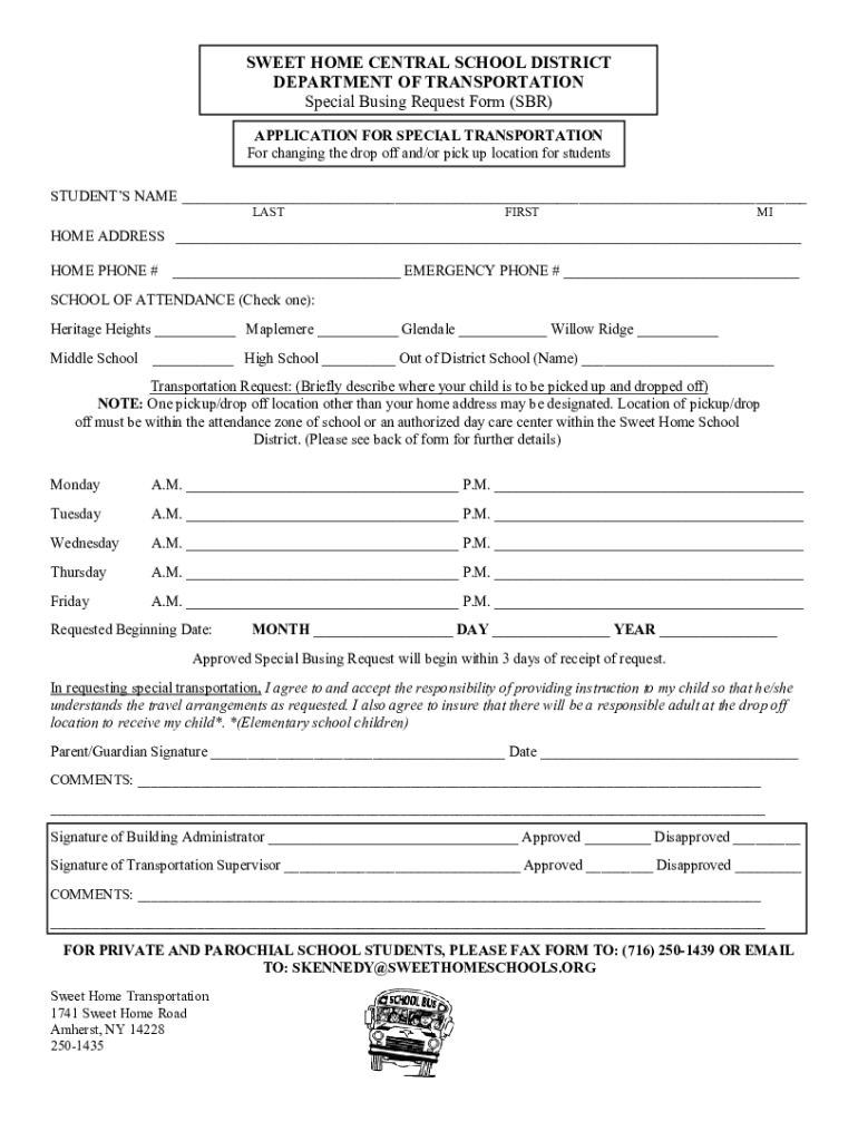 SWEET HOME CENTRAL SCHOOL DISTRICT SPECIAL BUSING REQUESTS (SBR) This form is used for parents or guardians of students in the Sweet Home school district to temporarily change their student\'s pick