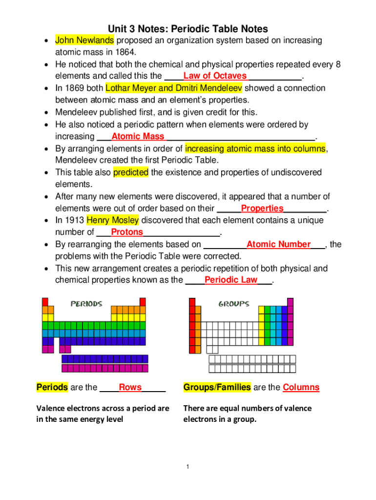Unit 3 Notes: Periodic Table Notes John Newlands proposed an organization system based on increasing atomic mass in 1864. He noticed that both the chemical and physical properties repeated every 8