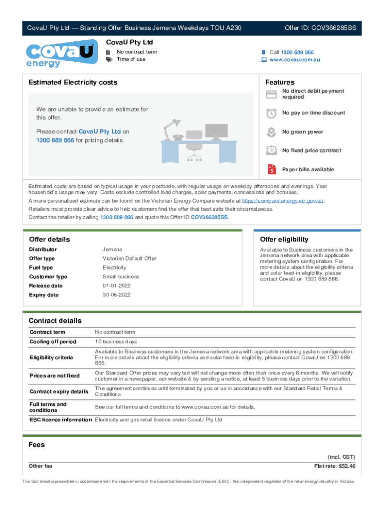 CovaU Pty Ltd Standing Offer Business Jemena Weekdays TOU A230Offer ID: COV366285SSCovaU Pty Ltd No contract term Time of useEstimated Electricity costsCall 1300 689 866 www.covau.com.auFeatures No