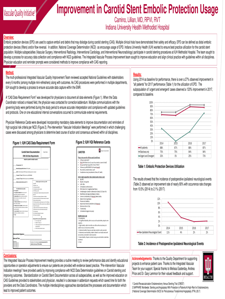 Improvement in Carotid Stent Embolic Protection Usage Camino, Lillian, MD, RPVI, RVT Indiana University Health Methodist Hospital Overview: Embolic protection devices (EPD) are used to capture emboli