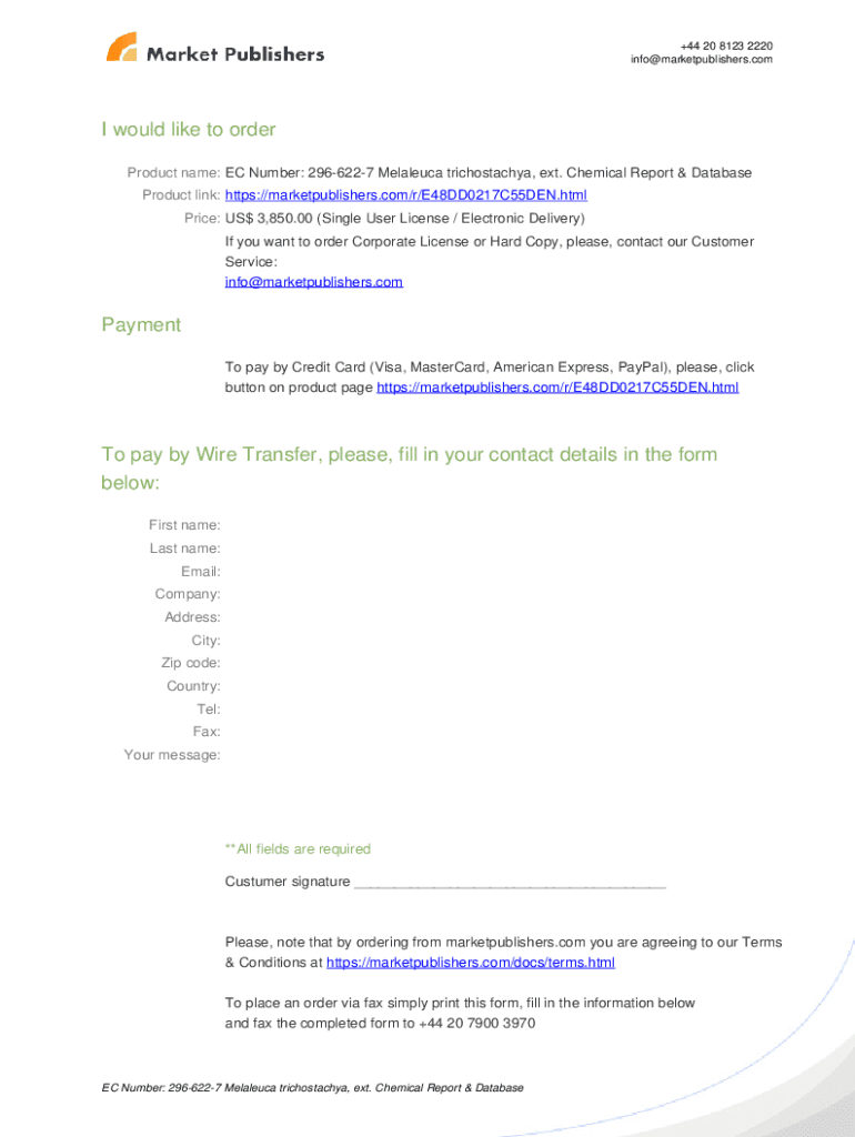 +44 20 8123 2220 info@marketpublishers.comEC Number: 2966227 Melaleuca trichostachya, ext. Chemical Report & Database https://marketpublishers.com/r/E48DD0217C55DEN.html Date: September 2019 Pages: