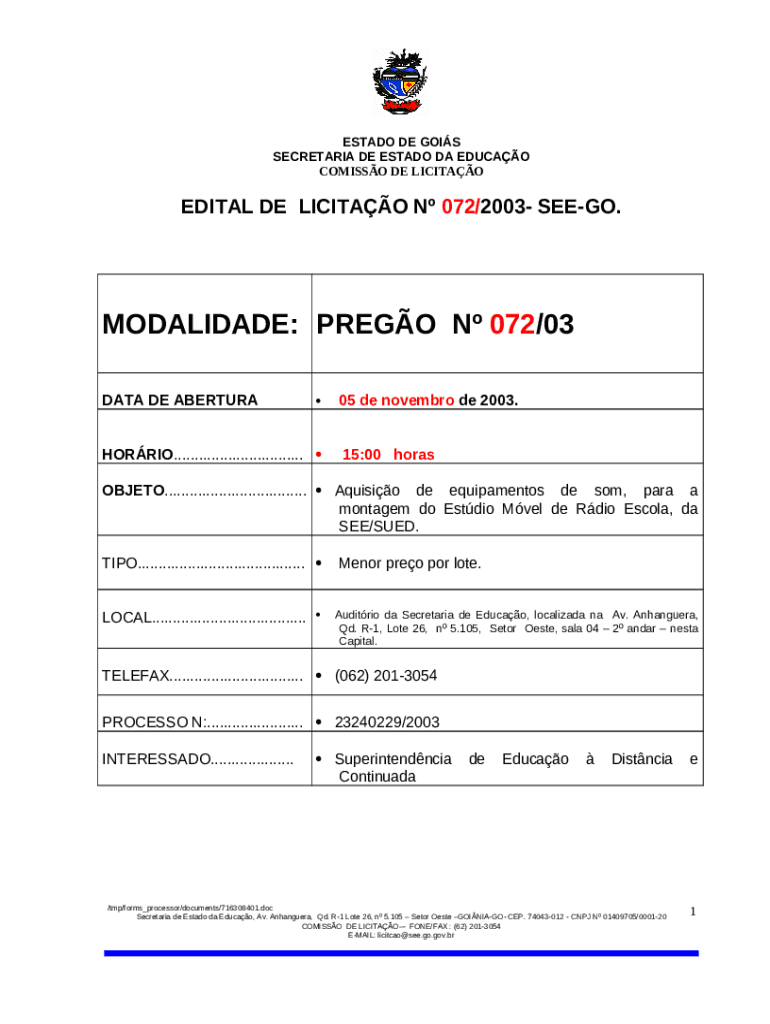 Instructions for the form Aquisio de equipamentos de som, para a montagem do Estdio Mvel de Rdio Escola, da SEE/SUED