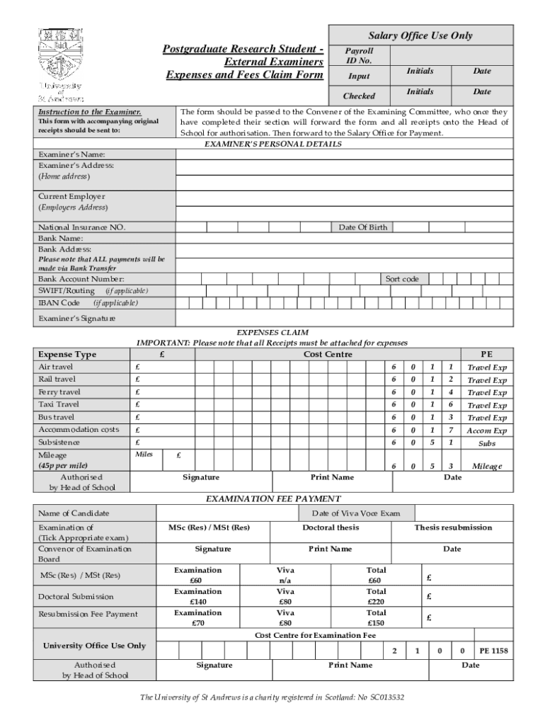 Salary Office Use OnlyPostgraduate Research Student External Examiners Expenses and Fees Claim FormPayroll ID No. Input CheckedInitialsDateInitialsDateThe form should be passed to the Convener of