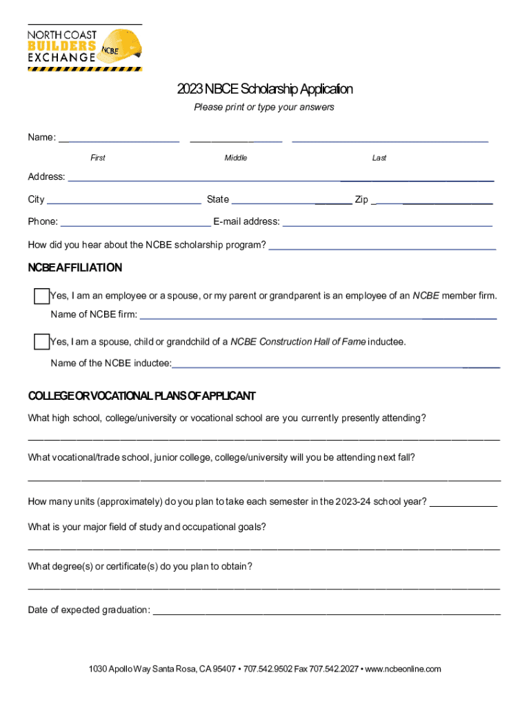 2023 NBCE Scholarship Program Sonoma, Mendocino, Lake, andNapa Counties Dear Scholarship Applicant, North Coast Builders Exchange (NCBE) is pleased to announce that the application period for our