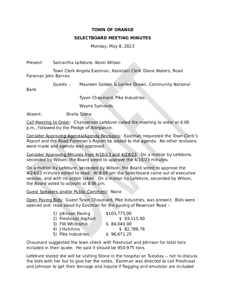 The Town Clerk Angela Eastman, Assistant Clerk Diane Waters, Road Foreman John Barnes is a writable document which can be completed and signed for certain purpose. Next, it is provided to the actual addressee in order to provide certain information of certain kinds. The completion and signing can be done manually in hard copy or with an appropriate service like PDFfiller. Such services help to send in any PDF or Word file without printing them out. It also lets you customize it according to your needs and put a legal electronic signature. Once done, you send the Town Clerk Angela Eastman, Assistant Clerk Diane Waters, Road Foreman John Barnes to the recipient or several ones by email and even fax. PDFfiller has got a feature and options that make your template printable. It provides different options for printing out appearance. No matter, how you will deliver a form - in hard copy or by email - it will always look well-designed and organized. In order not to create a new file from the beginning again and again, make the original file as a template. Later, you will have an editable sample.