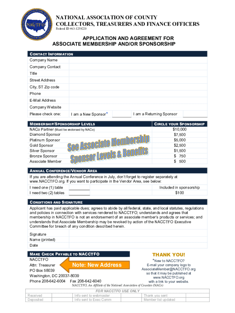 NATIONAL ASSOCIATION OF COUNTY COLLECTORS, TREASURERS AND FINANCE OFFICERS Federal ID #631259220APPLICATION AND AGREEMENT FOR ASSOCIATE MEMBERSHIP AND/OR SPONSORSHIP CONTACT INFORMATION Company Name