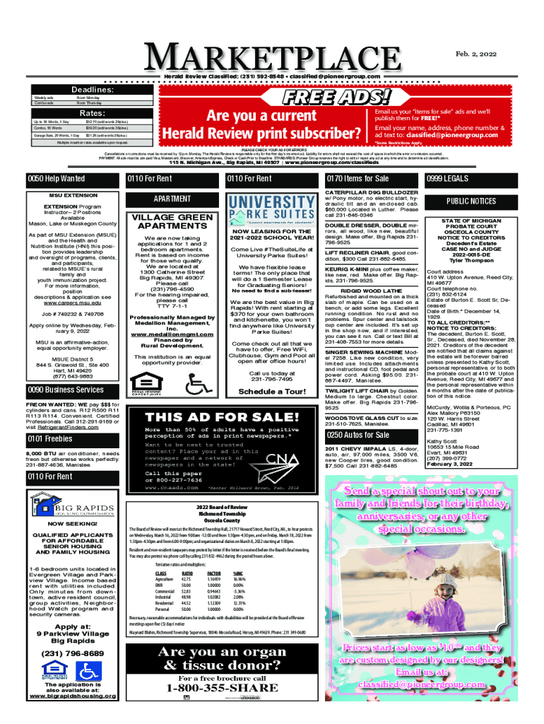 MarketplaceFeb. 2, 2022Herald Review Classified: (231) 5928348 classified@pioneergroup.comDeadlines: Weekly adsNoon MondayCombo adsNoon ThursdayFREE ADS!Rates: Up to 15 Words, 1 Day$12.70 (add words