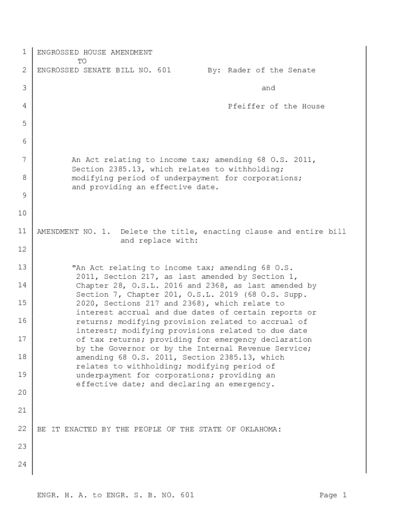 1 2ENGROSSED HOUSE AMENDMENT TO ENGROSSED SENATE BILL NO. 6013By: Rader of the Senate and4Pfeiffer of the House5 6 7 8An Act relating to income tax; amending 68 O.S. 2011, Section 2385.13, which relates