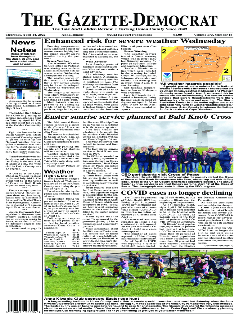 THE GAZETTEDEMOCRAT The Talk And Cobden Review Serving Union County Since 1849Thursday, April 14, 2022Anna, Illinois2022 Reppert Publications$1.00Volume 173, Number 18News Enhanced risk for severe