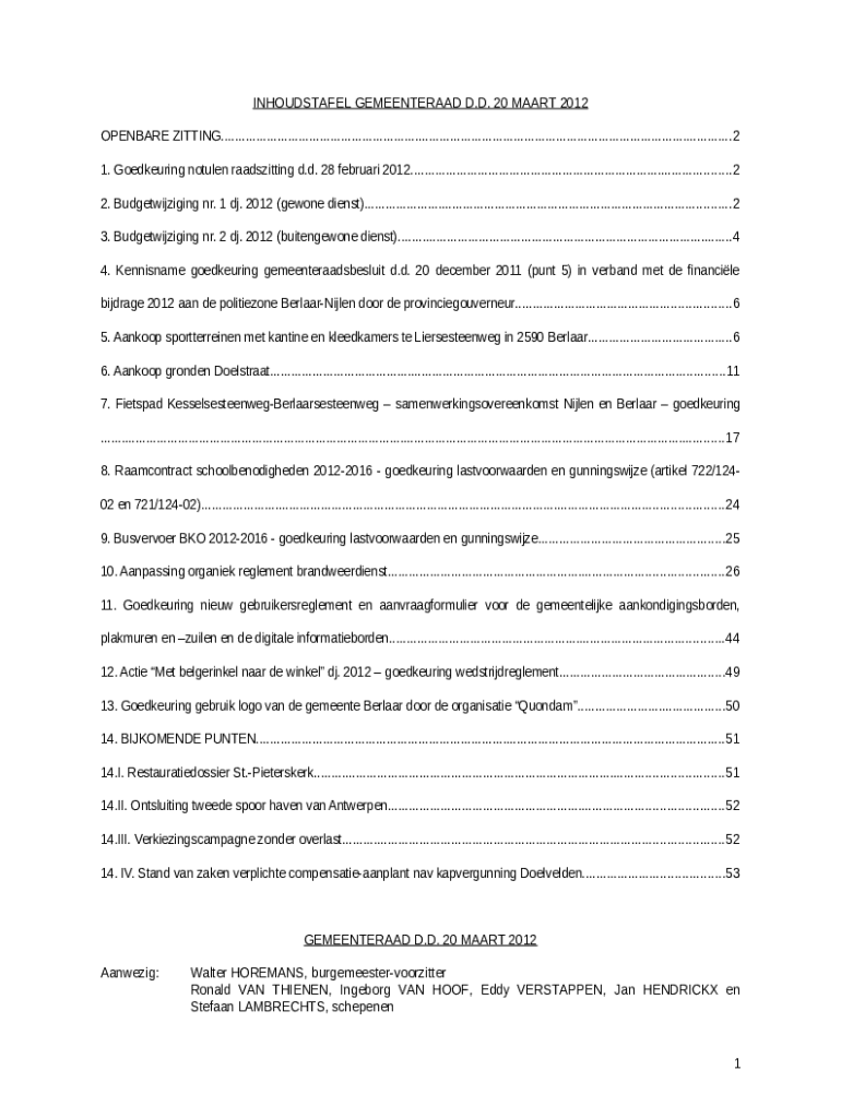 The NOTULEN VAN DE GEMEENTERAAD zitting van 20 maart ... is a Word document that can be filled-out and signed for specific purposes. Next, it is provided to the actual addressee in order to provide specific details of certain kinds. The completion and signing is able or with an appropriate solution like PDFfiller. These applications help to complete any PDF or Word file without printing them out. It also allows you to customize its appearance according to the needs you have and put legit digital signature. Once you're good, the user ought to send the NOTULEN VAN DE GEMEENTERAAD zitting van 20 maart ... to the recipient or several recipients by mail or fax. PDFfiller includes a feature and options that make your blank printable. It includes various settings for printing out. It doesn't matter how you will send a form - physically or electronically - it will always look neat and clear. In order not to create a new file from scratch again and again, make the original document into a template. Later, you will have a customizable sample.