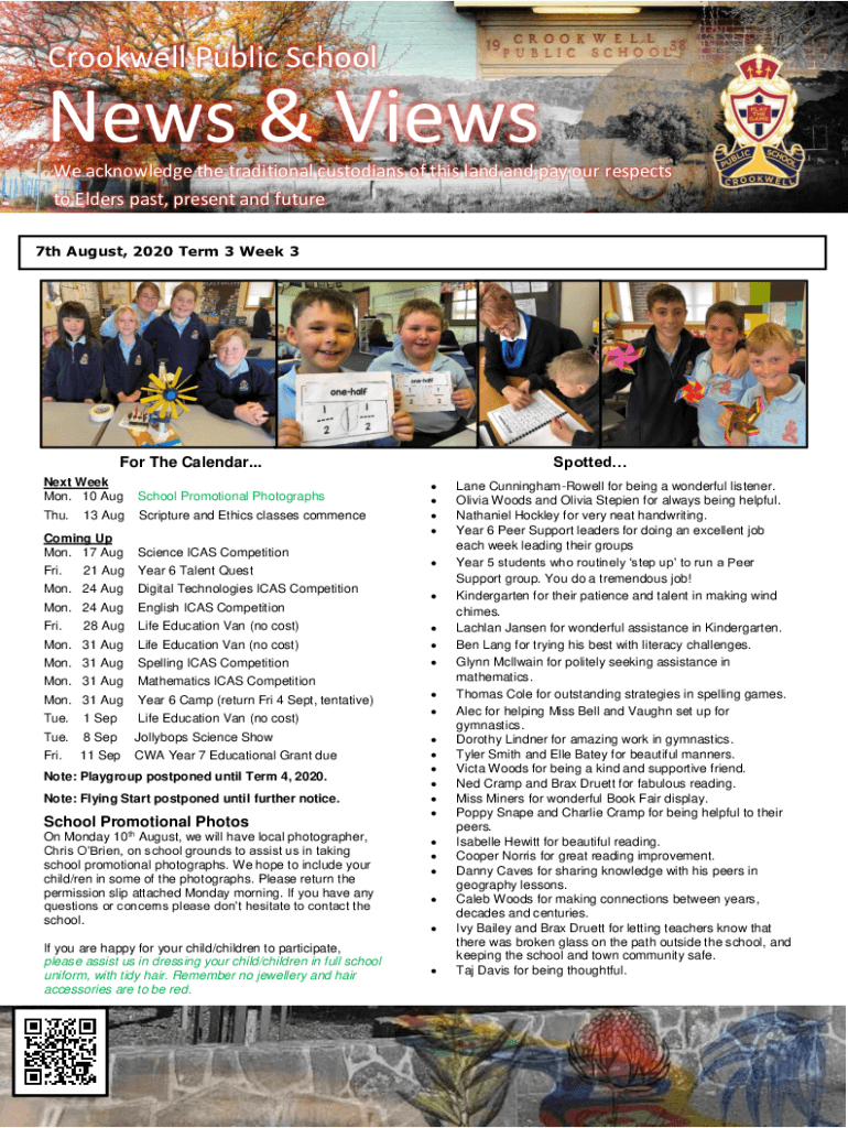 Crookwell Public SchoolNews & Views We acknowledge the traditional custodians of this land and pay our respects to Elders past, present and future 7th August, 2020 Term 3 Week 3SpottedFor The Calendar...