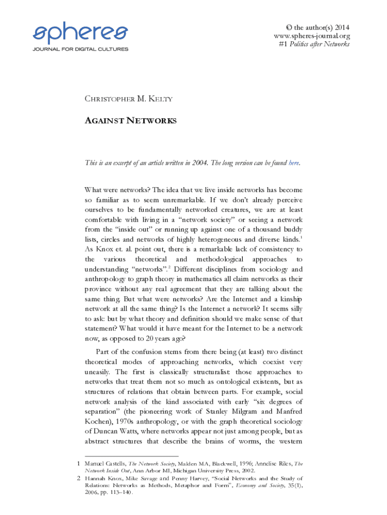 #1 Politics after NetworksCHRISTOPHER M. KELTYAGAINST NETWORKSThis is an excerpt of an article written in 2004. The long version can be found here. What were