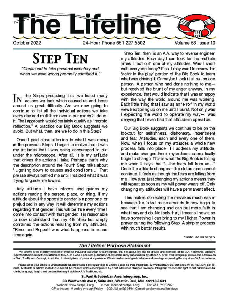 October 202224Hour Phone 651.227.5502Step TenContinued to take personal inventory and when we were wrong promptly admitted it.Inthe Steps preceding this, we listed many actions we took which caused