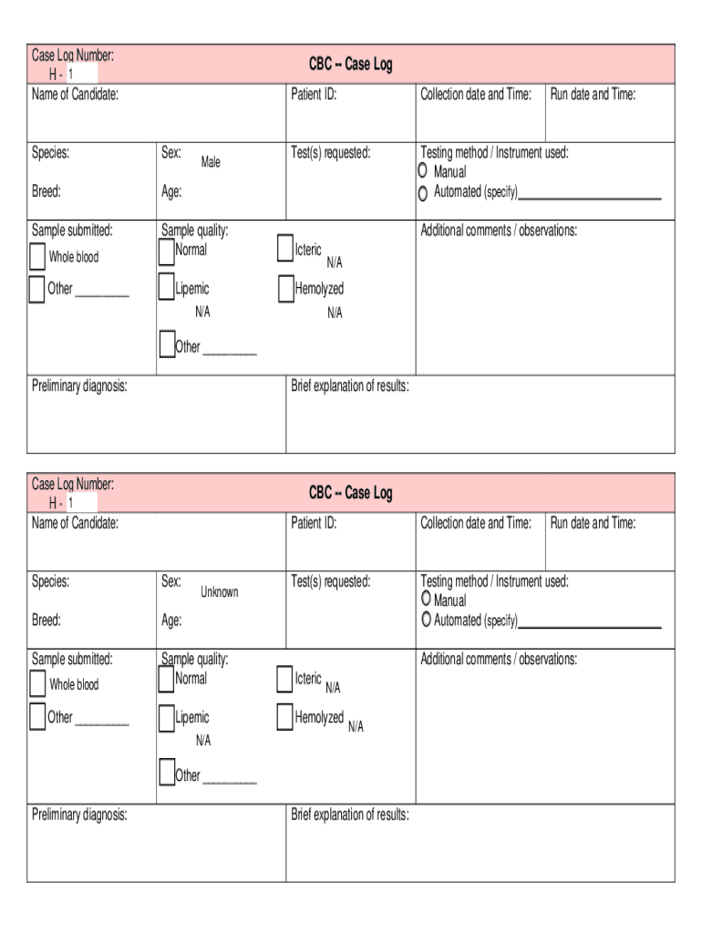 Case Log Number: H 1 Name of Candidate:CBC Case LogSpecies:Sex:Breed:Age:Sample submitted:Sample quality: NormalWhole bloodOther ___MalePatient ID:Collection date and Time:Run date and Time:Test(s)