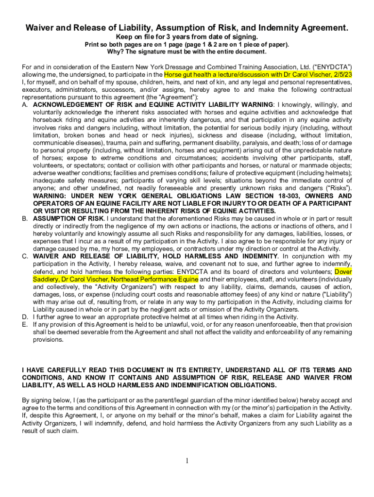 Waiver and Release of Liability, Assumption of Risk, and Indemnity Agreement. Keep on file for 3 years from date of signing. Print so both pages are on 1 page (page 1 & 2 are on 1 piece of paper).