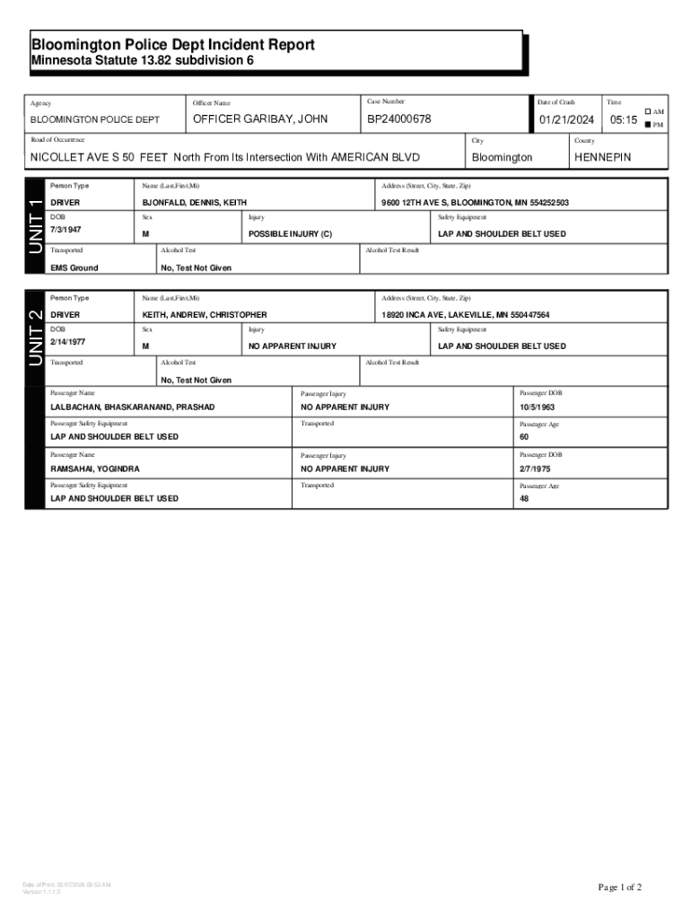 Bloomington Police Dept Incident Report Minnesota Statute 13.82 subdivision 6AgencyOfficer NameCase NumberDate of CrashBLOOMINGTON POLICE DEPTOFFICER GARIBAY, JOHNBP2400067801/21/2024Time05:15CityCountyNICOLLET