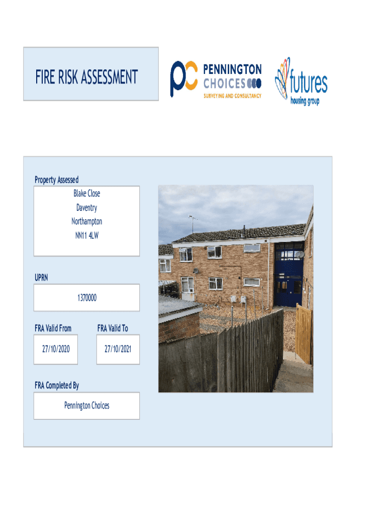 FIRE RISK ASSESSMENTProperty Assessed Blake Close Daventry Northampton NN11 4LWUPRN 1370000 FRA Valid From 27/10/2020FRA Valid To 27/10/2021FRA Completed By Pennington ChoicesEXECUTIVE SUMMARYResponsible