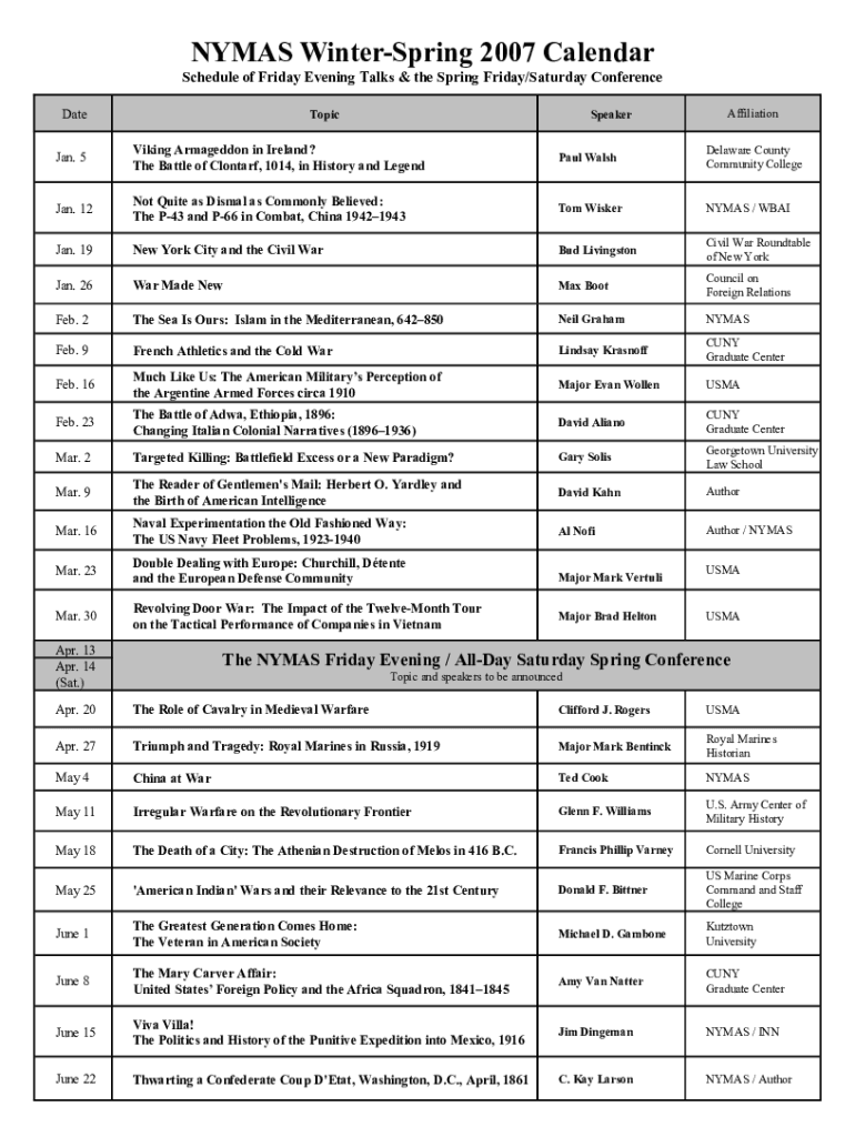 NYMAS WinterSpring 2007 Calendar Schedule of Friday Evening Talks & the Spring Friday/Saturday Conference DateTopicSpeakerAffiliationJan. 5Viking Armageddon in Ireland? The Battle of Clontarf, 1014,