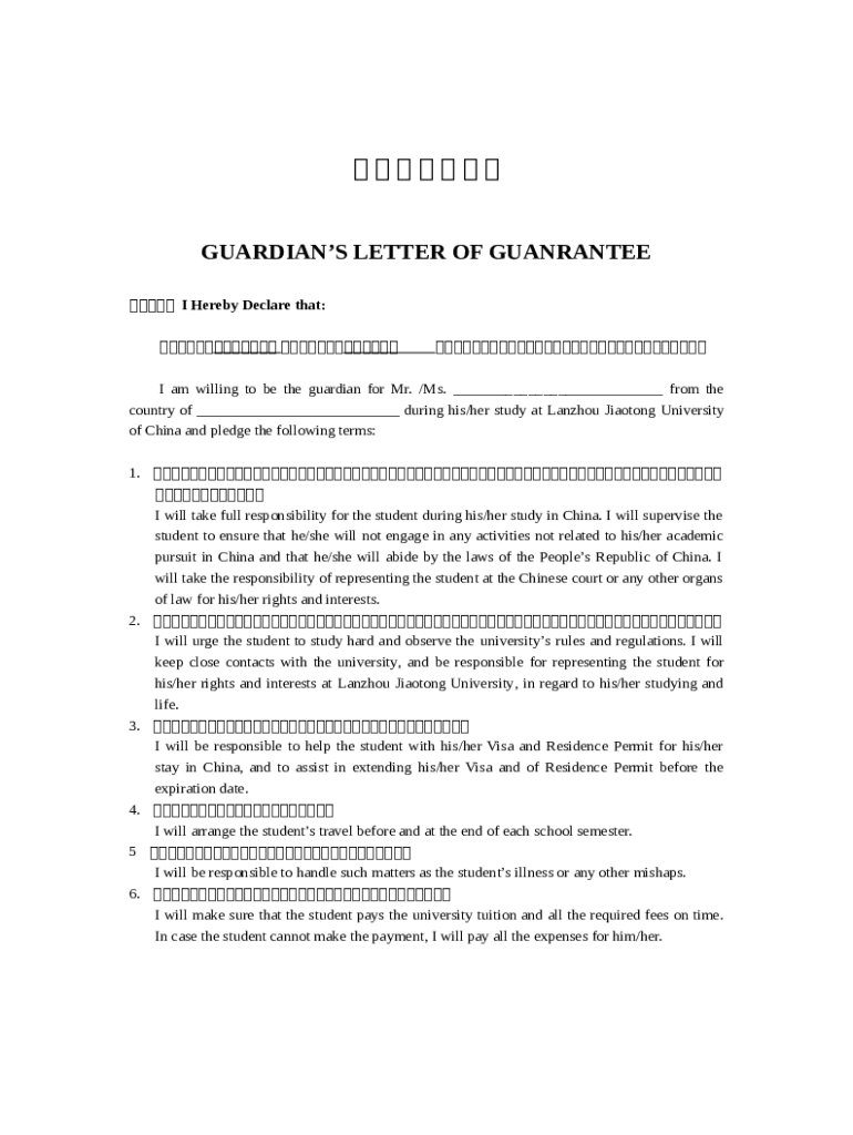 What is GUARDIAN'S LETTER OF GUANRANTEE - Study-in-china.org Form?