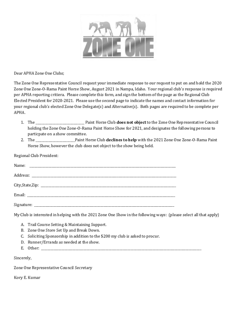 Dear APHA Zone One Clubs; The Zone One Representative Council request your immediate response to our request to put on and hold the 2020 Zone One ZoneORama Paint Horse Show, August 2021 in Nampa,
