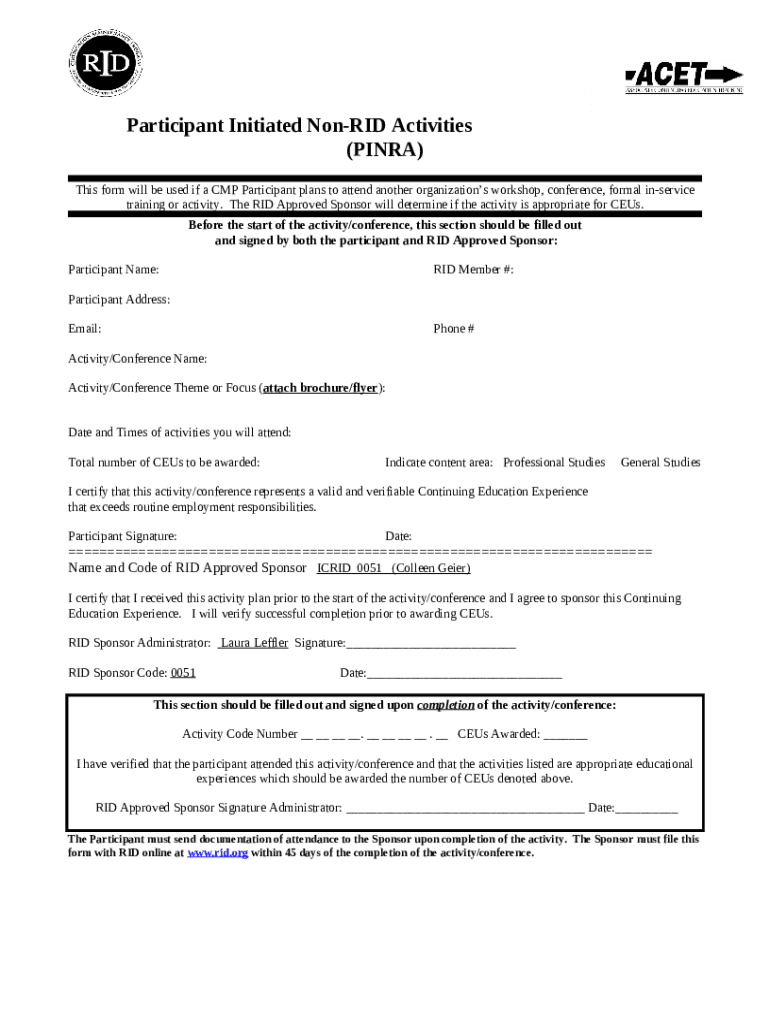 What is Instructions for Participant Initiated Non-RID Activities Form?
