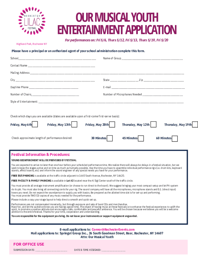 OUR MUSICAL YOUTHENTERTAINMENT APPLICATION Highland Park, Rochester NYFor performances on: Fri 5/6, Thurs 5/12, Fri 5/13, Thurs 5/19, Fri 5/20Please have a principal or an authorized agent of your