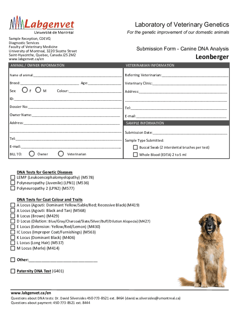 Laboratory of Veterinary Genetics For the genetic improvement of our domestic animals Sample Reception, CDEVQ Diagnostic Services Faculty of Veterinary Medicine University of Montreal, 3220 Sicotte