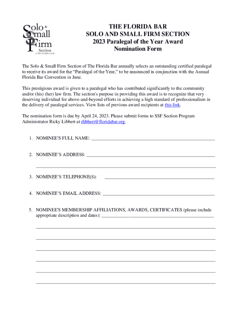THE FLORIDA BAR SOLO AND SMALL FIRM SECTION 2023 Paralegal of the Year Award Nomination Form The Solo & Small Firm Section of The Florida Bar annually selects an outstanding certified paralegal to