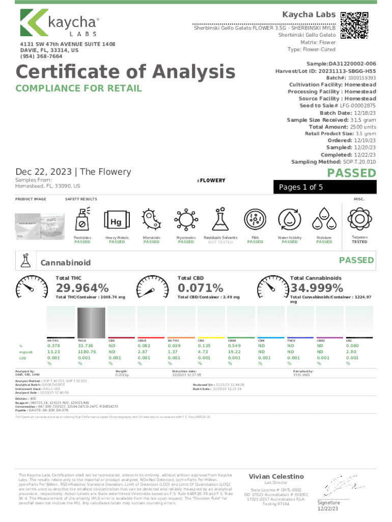 Kaycha Labs Sherbinski Gello Gelato FLOWER 3.5G SHERBINSKI MYLB Sherbinski Gello Gelato Matrix: Flower Type: FlowerCured4131 SW 47th AVENUE SUITE 1408 DAVIE, FL, 33314, US (954) 3687664Certicate of