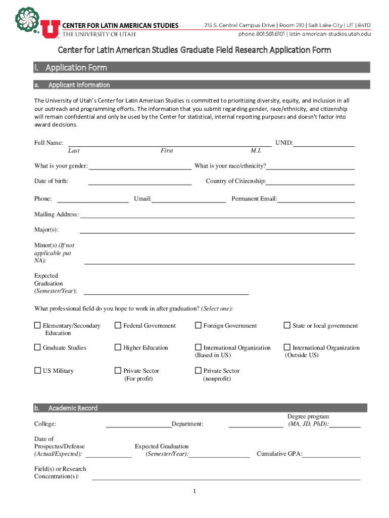Center for Latin American Studies Graduate Field Research Application Form I. Application Form a.Applicant InformationThe University of Utahs Center for Latin American Studies is committed to prioritizing
