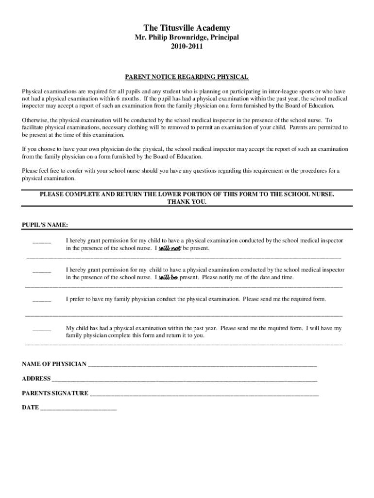 20102011PARENT NOTICE REGARDING PHYSICAL examinations are required for all pupils and any student who is planning on participating in interleague