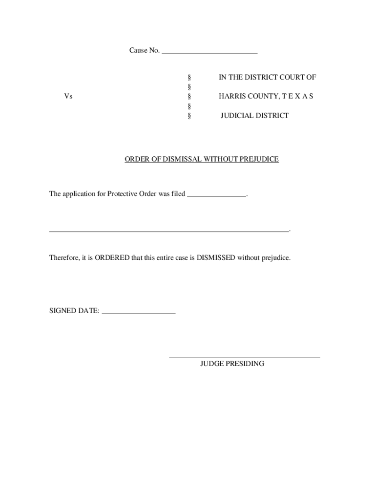 JUDICIAL DISTRICTORDER OF DISMISSAL WITHOUT Prejudice application for Protective Order was filed ___.___. Therefore, it is ORDERED